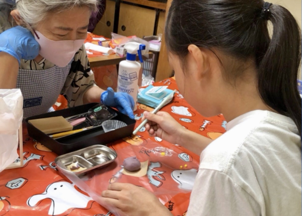 練り切り体験コーナーでは、同センター講座の講師を務める礒部浩子さん(61歳)と生徒の梶田富子さん(66歳)が、ハロウィンにちなんだ練り切り(和菓子)の体験を行い、子どもたちに楽しく伝えていた。体験した鈴木琴子さん(小学5年)は、「前から練り切りをやってみたかったので、うれしくてとても楽しかったです。思ったより上手にできたので、食べるのがもったいないくらいです」と満面の笑顔を見せていた。