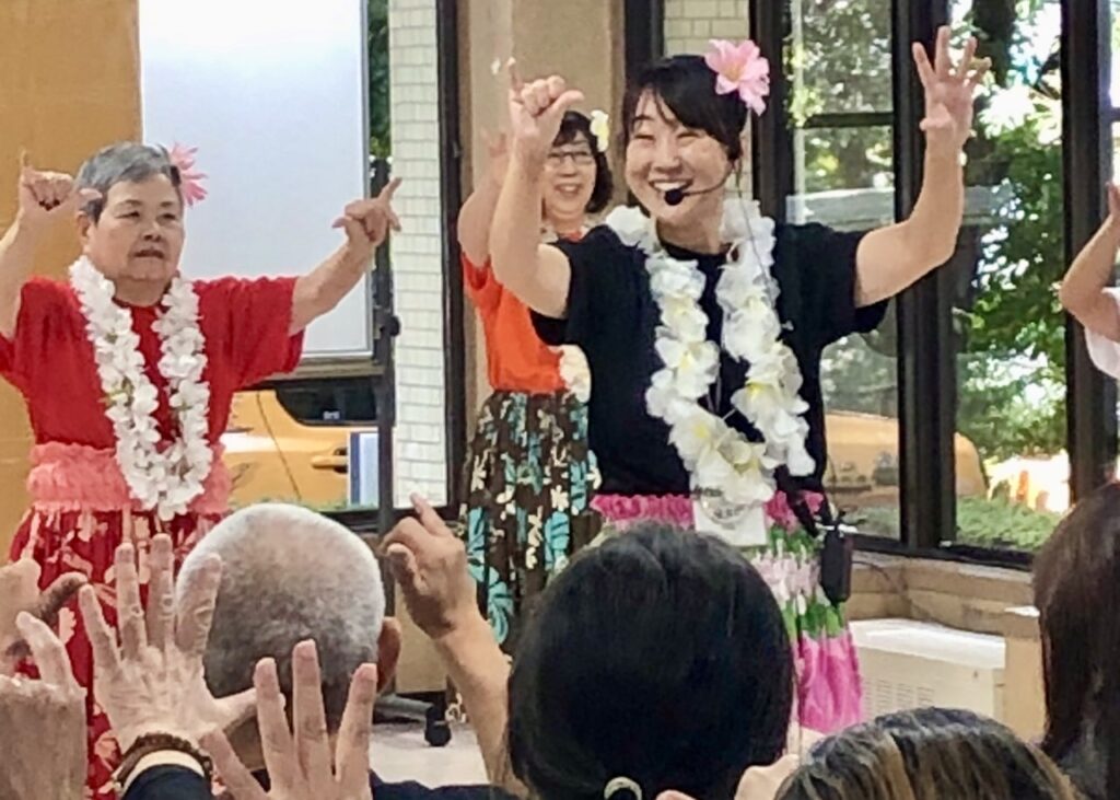 フラダンスを取り入れた健康体操「フラトレ®︎」を披露した講師の平戸かおるさん(49歳)が、「楽しかったことを思い出して笑顔で踊りましょう!」と来場者に呼び掛けると、会場は一体となって楽しく体操を行った。