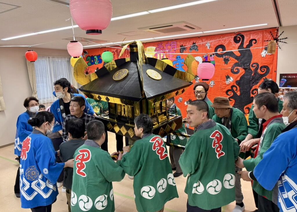 最後に利用者らは、毎年恒例の手作りの神輿(みこし)担ぎを行った。この神輿担ぎも今年で4回目となり、利用者らの参加意欲も高まってきたという。祭りを終えた利用者らは「楽しかった」、「またやりたい」と特別な日の感想を話していた。