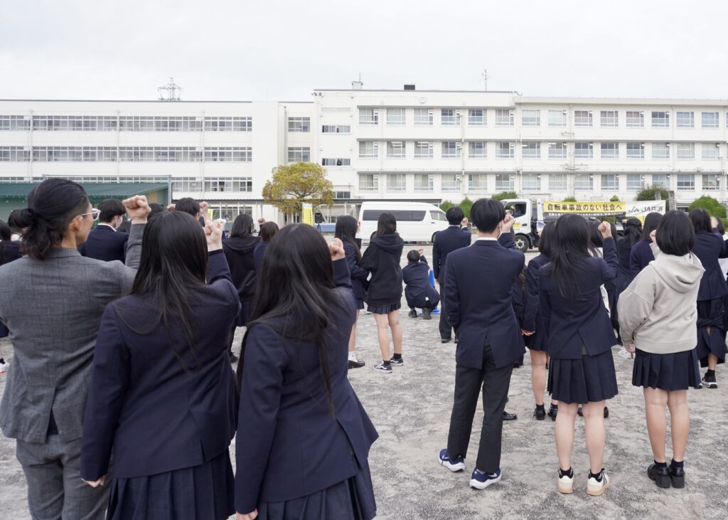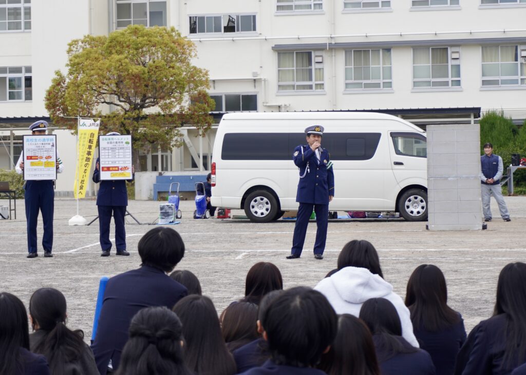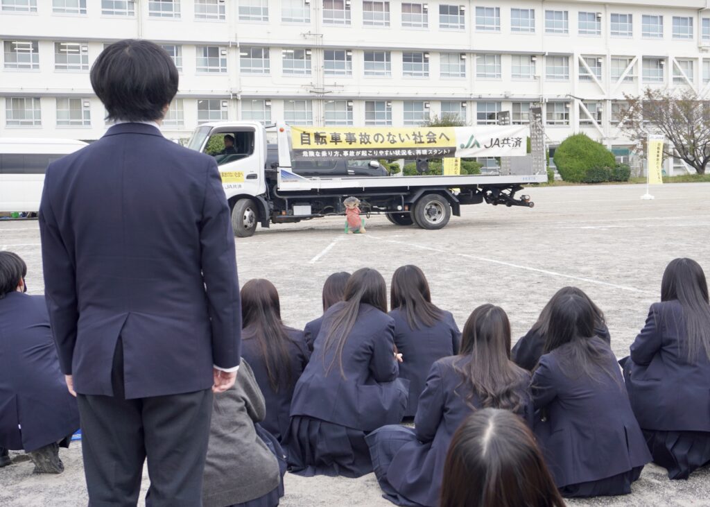 地域の交通安全啓発活動の一環として、JA共済連愛知が主催する「自転車の交通安全教室」が11月13日、名古屋市立若宮商業高等学校で開催された。今回は2年生と3年生を対象に実施され、スタントマンが事故の状況を再現し、生徒たちに交通ルールの重要性を訴えた。また学校や警察署の啓発活動として、この様子を上からドローンで撮影するという初の試みも行われた。