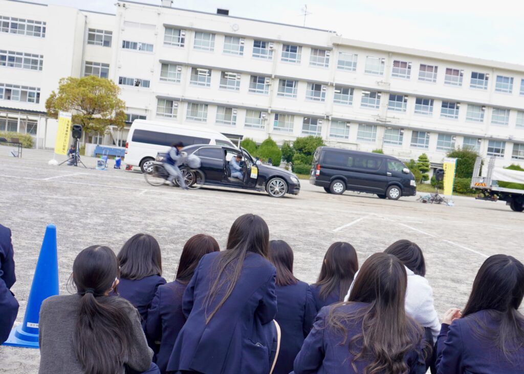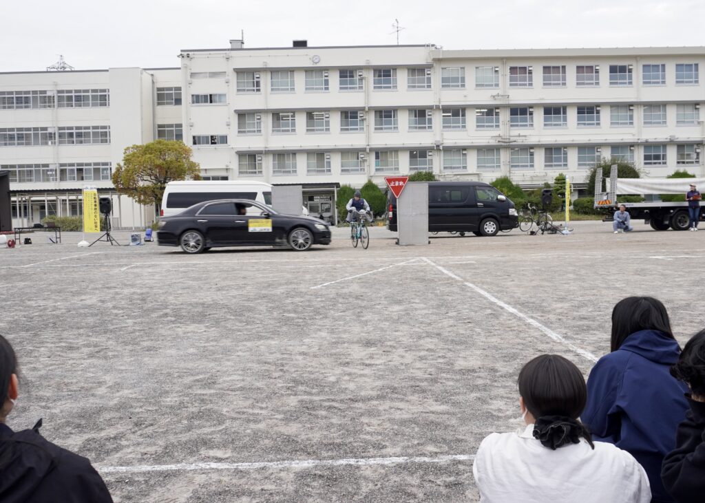 同教室では、さまざまな事故現場が再現され、見通しの悪い道路を横断する際の一時停止の重要性や厳罰化された自転車の交通ルールについての確認の大切さが伝えられた。生徒たちは身近な事故を目の前で再現されることで、安全な乗車方法について考える機会となり、実際に車とスタントマンが衝突する場面では、悲鳴や驚きの声が上がる場面もあった。