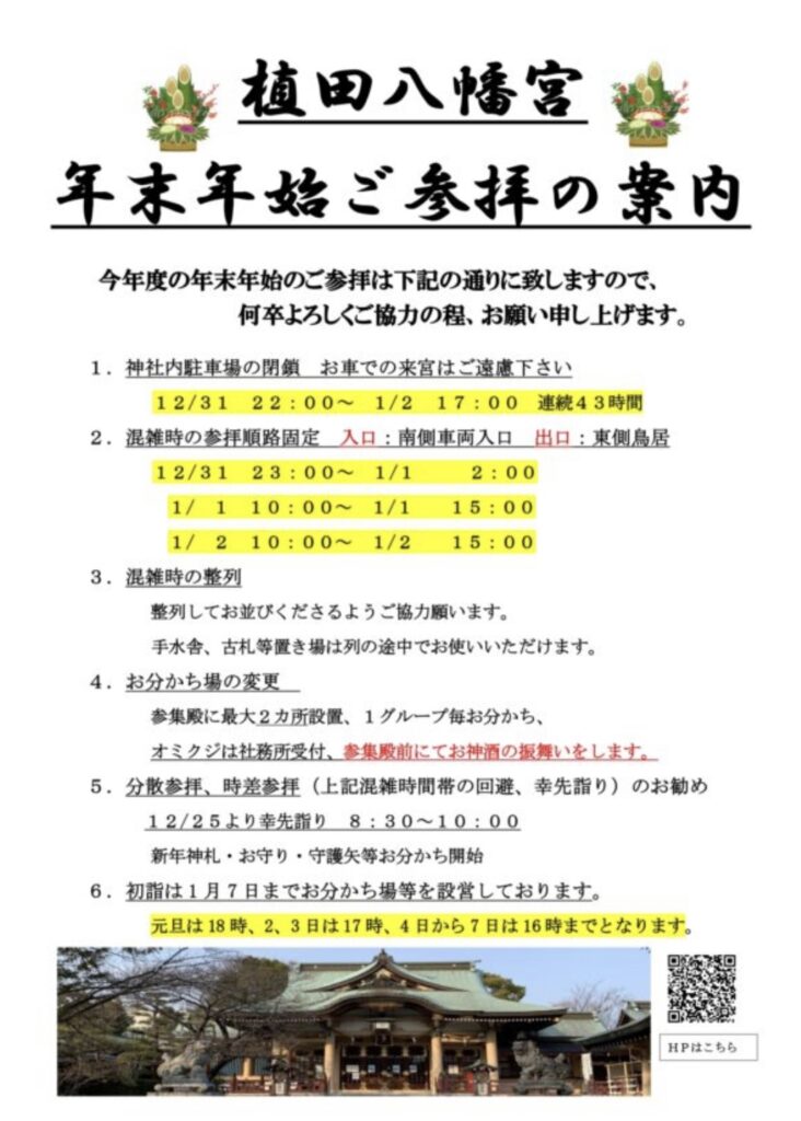 12月31日午後1時から大祓(おおはらい)が行われ、特別祈願も受け付けています(希望者は12時50分までに社務所前の受付で申し込み)。1月1日の初詣は午前0時から甘酒が振る舞われ、焼きそばや牛串、たません、ラーメンなどのキッチンカーが並びます。厄払いや就職祈願も受け付けています(予約は電話、またはホームページから)。